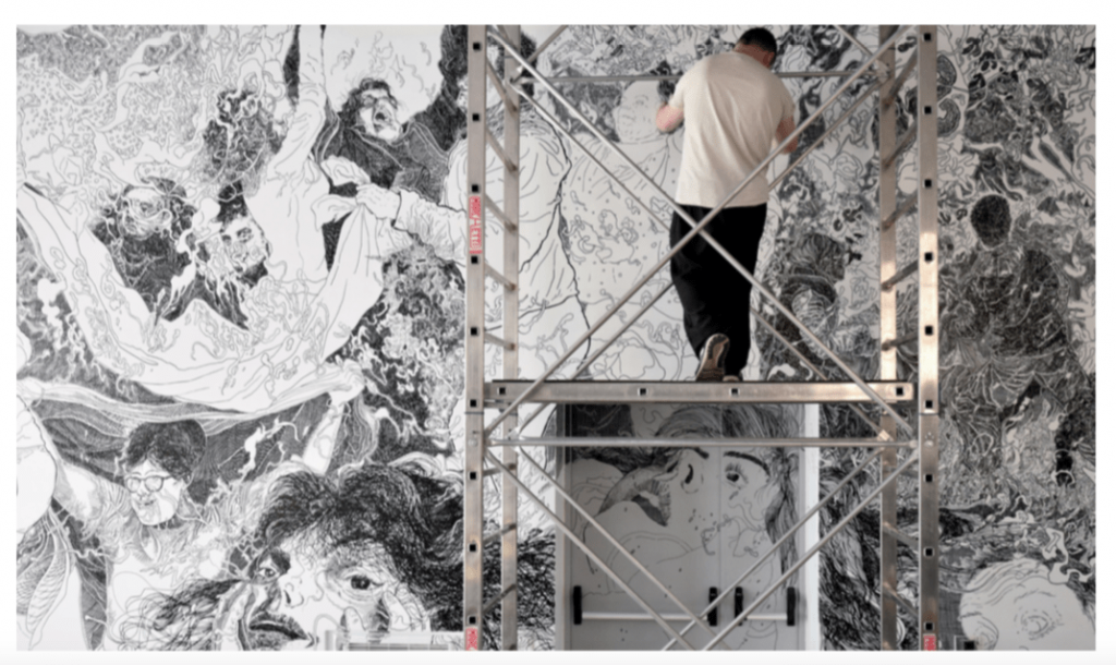Epopteia! è l’ultima tappa di Scribblitti, serie di performance che combinano una fase di ascolto alla realizzazione di un enorme disegno a mano libera su parete, senza l’utilizzo di alcun canovaccio. Realizzato nella Sala Civica della Polveriera, Epopteia!, vero e proprio percorso di illuminazione, è un racconto vortice che raccoglie paure, sogni, dolore, speranze ed è nato dall’incontro, da novembre 2019 a gennaio 2020, dell’artista con un gruppo di “abitanti” della Polveriera. Gli oltre sessanta metri quadrati sono, prima di tutto, esperienza di consapevolezza, di presenza e di ascolto, di condivisione e di comprensione, di produzione e di strati cazione di materiali e documentazione. Corpus non esente da un certo grado di imprevedibilità, come è del resto la natura stessa di ogni esperienza autentica, inscindibile dall’opera e proiettato in ulteriori scenari.