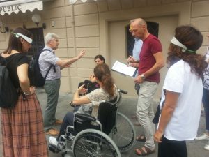 Sono stati tre gli incontri realizzati con tecnici ed esperti: i primi due, in aula, hanno affrontato la contestualizzazione tecnico – normativa, e quindi le norme specifiche per l’edilizia pubblica e privata e il ruolo della pubblica amministrazione, e la progettazione degli ambienti, in particolare il tema della fruibilità degli spazi per le persone con disabilità sensoriali. Il terzo incontro, invece, è stato un laboratorio pratico esperienziale di rilievo ambientale, in cui i partecipanti hanno testato con mano cosa significa essere una persona disabile, girando per la città su appositi ausili forniti dalla ditta “Ottobock soluzioni ortopediche”.