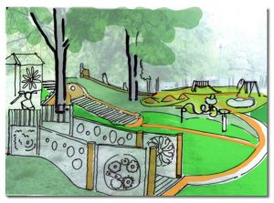 Ed ecco soluzioni che prevedono l’ uso di materiali colorati, sicuri, il più possibile naturali, magari con pavimentazioni sagomate come grandi foglie di diverse essenze, con arredi ripristinati o del tutto nuovi, ma mai banali, con un logo identificativo del parco stesso,con aree distinte e collegate da percorsi.