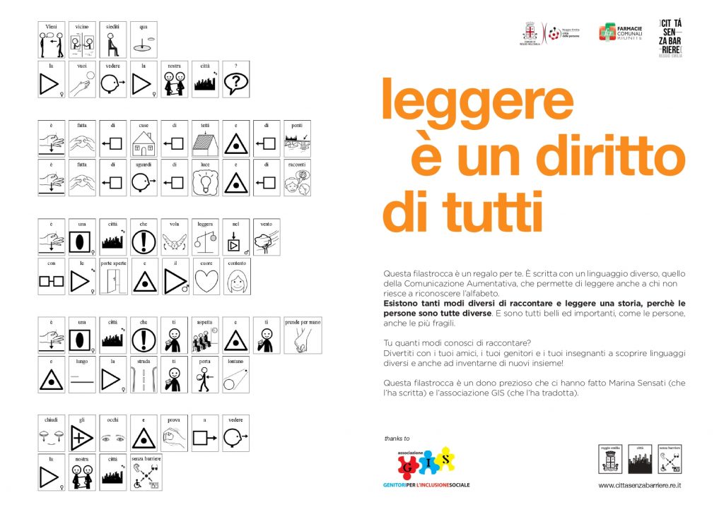 Una filastrocca scritta con un linguaggio diverso (realizzata in collaborazione con GIS – Genitori per l’Inclusione Sociale), quello della comunicazione aumentata alternativa, per permettere di leggere anche a chi non riesce a riconoscere l’alfabeto.