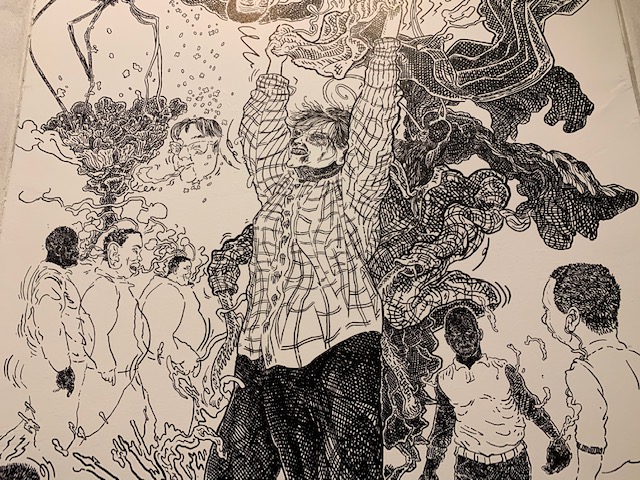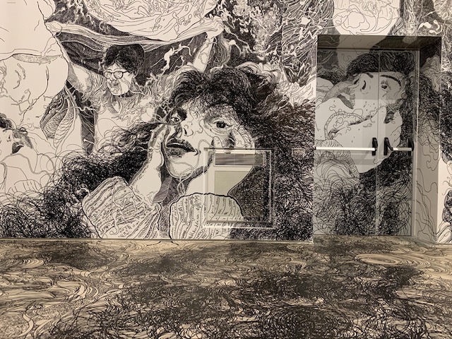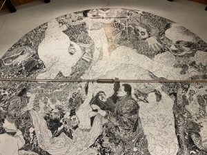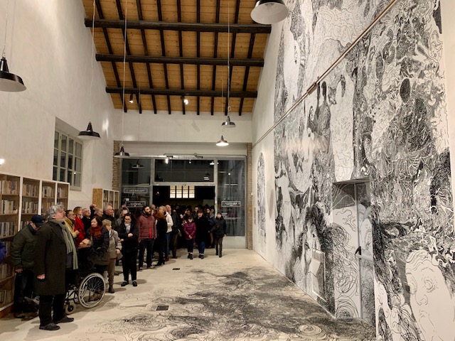 Epopteia! è l’ultima tappa di Scribblitti, serie di performance che combinano una fase di ascolto alla realizzazione di un enorme disegno a mano libera su parete, senza l’utilizzo di alcun canovaccio. Realizzato nella Sala Civica della Polveriera, Epopteia!, vero e proprio percorso di illuminazione, è un racconto vortice che raccoglie paure, sogni, dolore, speranze ed è nato dall’incontro, da novembre 2019 a gennaio 2020, dell’artista con un gruppo di “abitanti” della Polveriera. Gli oltre sessanta metri quadrati sono, prima di tutto, esperienza di consapevolezza, di presenza e di ascolto, di condivisione e di comprensione, di produzione e di strati cazione di materiali e documentazione. Corpus non esente da un certo grado di imprevedibilità, come è del resto la natura stessa di ogni esperienza autentica, inscindibile dall’opera e proiettato in ulteriori scenari.