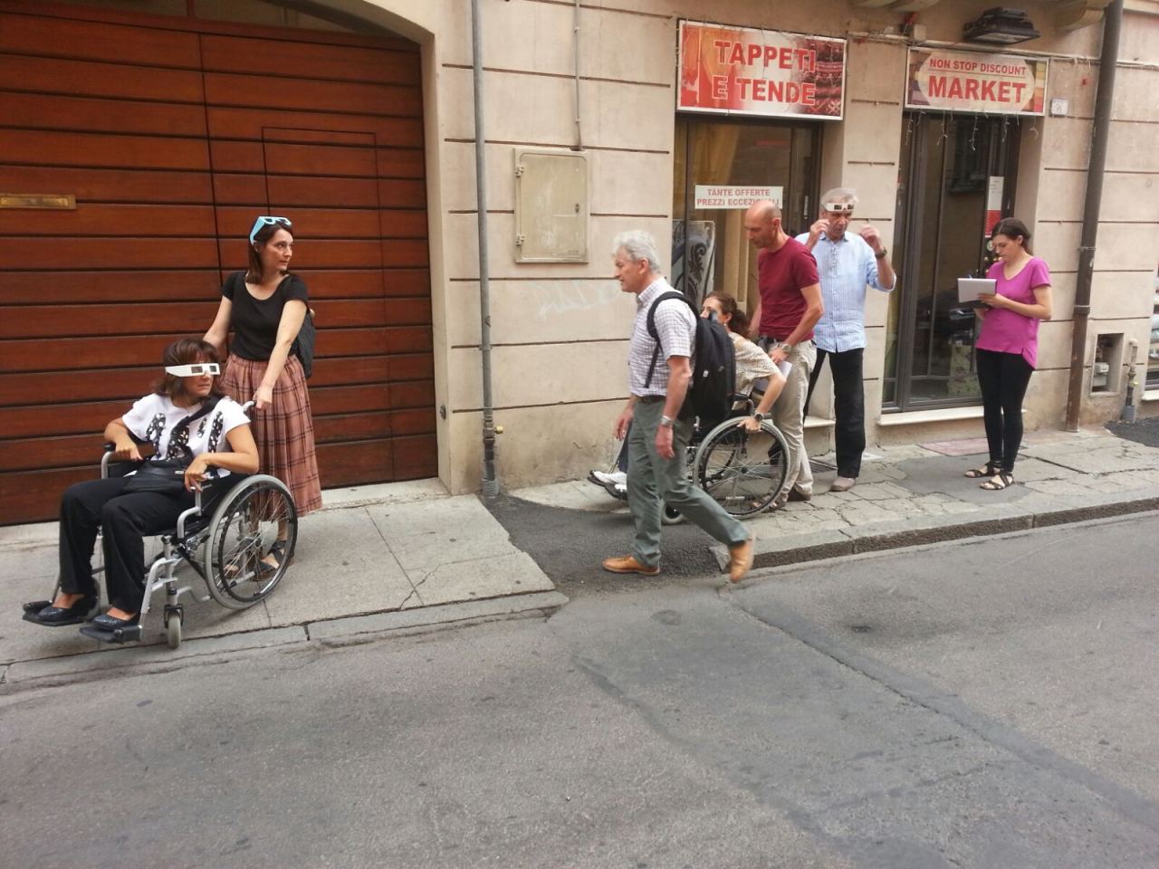 A passeggio per il centro storico di Reggio Emilia su una sedia a rotelle, come le persone paraplegiche, oppure...
